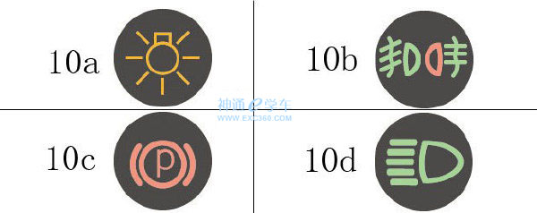 解析:10a:车灯总开关;10b:前后雾灯;10c:驻车制动器处于制动状态;10d:远光灯。